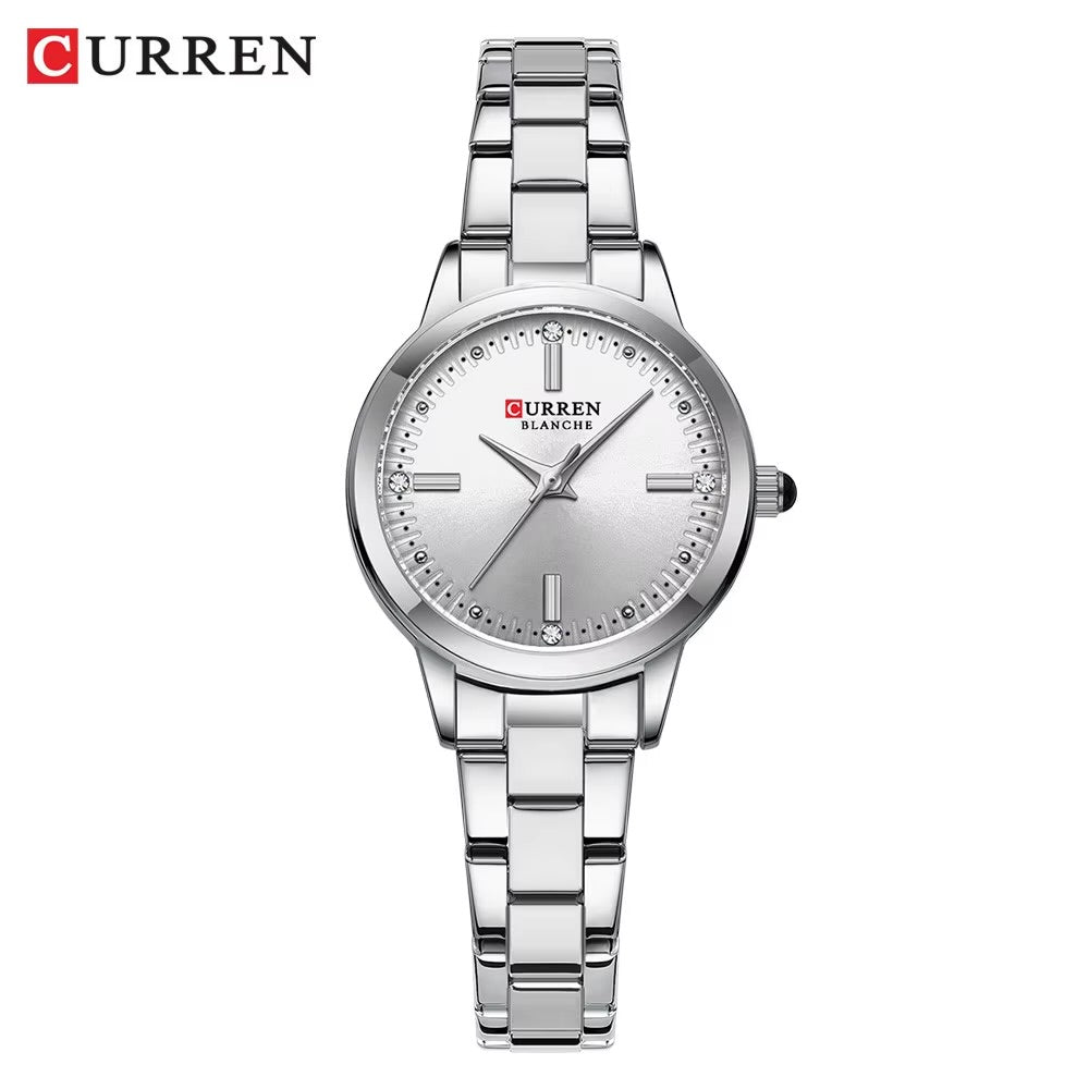 ساعة نسائية أنيقة من ماركة Curren بتصميم عصري يجمع بين البساطة والفخامة. تأتي بقرص فضي راقٍ مع مؤشرات مرصعة بتفاصيل لامعة تضيف لمسة أنثوية جذابة، مع سوار معدني فاخر باللون الفضي يمنح الساعة مظهراً راقياً يناسب جميع الإطلالات.