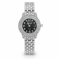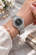 تألقي بإطلالة راقية مع هذه الساعة النسائية الفاخرة المصممة بعناية لتجمع بين الأناقة واللمعان. تأتي الساعة بسوار فضي أنيق مرصّع بأحجار كريستالية لامعة تضيف لمسة فاخرة إلى معصمك، مع إطار دائري مزدوج مرصّع بالكريستال يمنحها مظهراً مميزاً وجذاباً. يتميز قرص الساعة باللون الأسود الأنيق مع مؤشرات لامعة واضحة لقراءة الوقت بسهولة، ما يجعلها قطعة مثالية للاستخدام اليومي أو للمناسبات الخاصة.